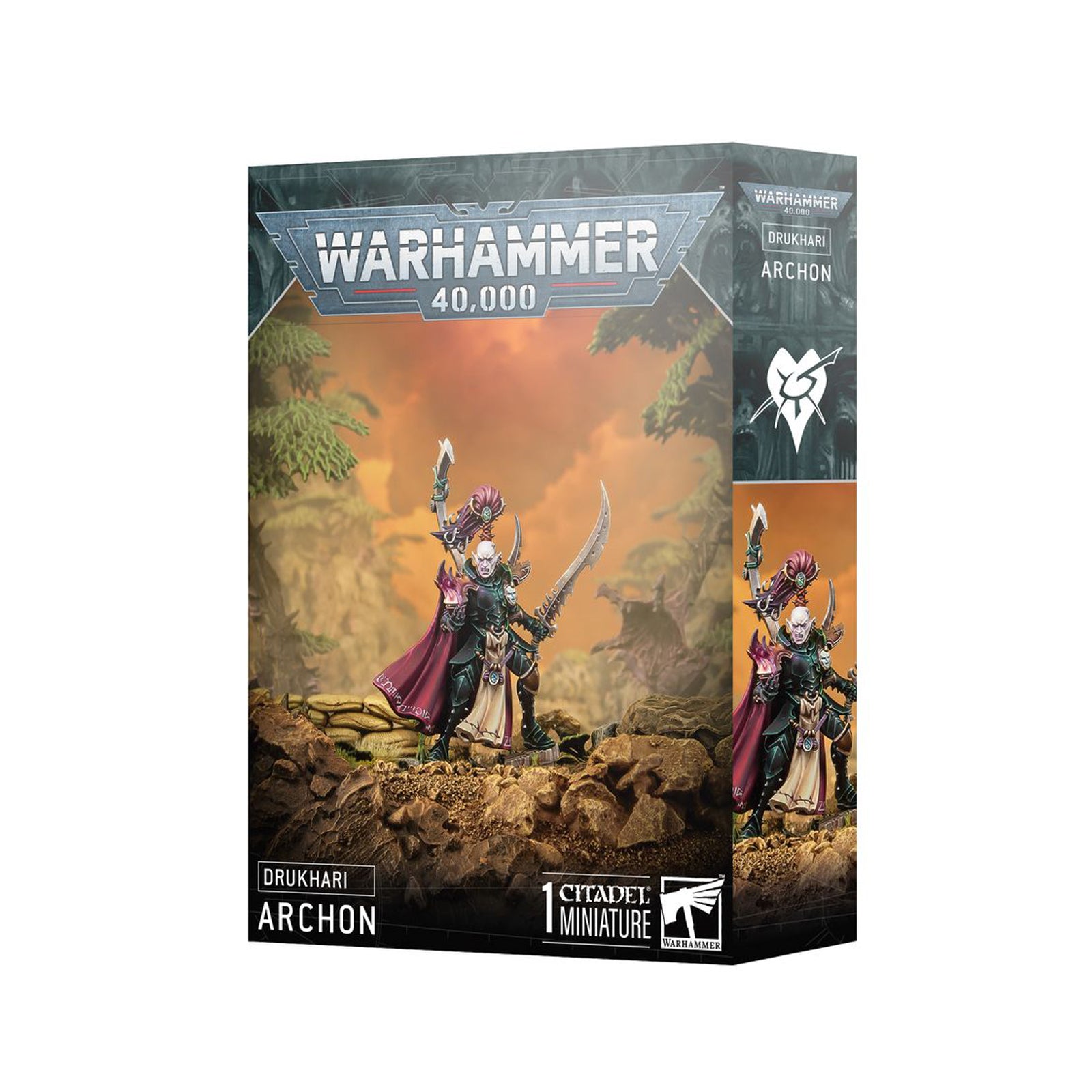 This multipart plastic kit builds one Archon, a cruel and sadistic leader for your Drukhari armies in games of Warhammer 40,000. They specialise in leading realspace raids and claiming captives to be taken back to the dark city of Commorragh. The Archon can be equipped with your choice of soul trap, blast pistol, or splinter pistol, and agoniser, huskblade, or master-crafted power weapon. There are two different options for the chest, three heads, a choice of two belts, and a striking scenic base. No matter how you build them, their dynamic pose and sinister details will look fantastic whether leading your army to victory or being worked on at your painting table.