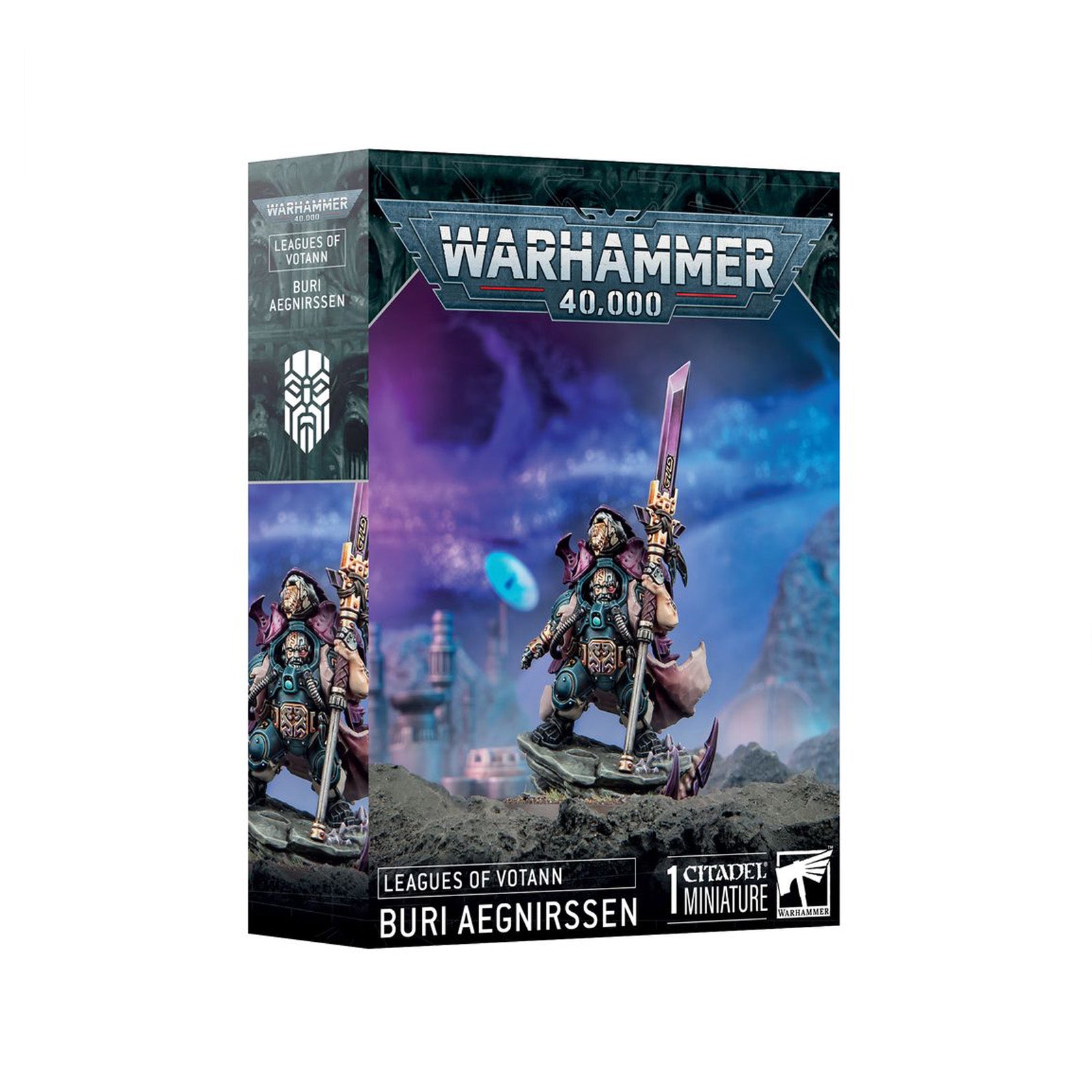 This multipart plastic kit builds Buri Aegnirssen, a ferocious leader for your Leagues of Votann armies in games of Warhammer 40,000. This savage soldier has seen countless battles and endured injuries that would have laid most Kin low. He wields a custom darkstar glaive and an Autoch-pattern bolt pistol sidearm with expert skill. Buri is the ideal commander for an aggressive force as he likes to get to grips with his foes, no matter who or what they are.