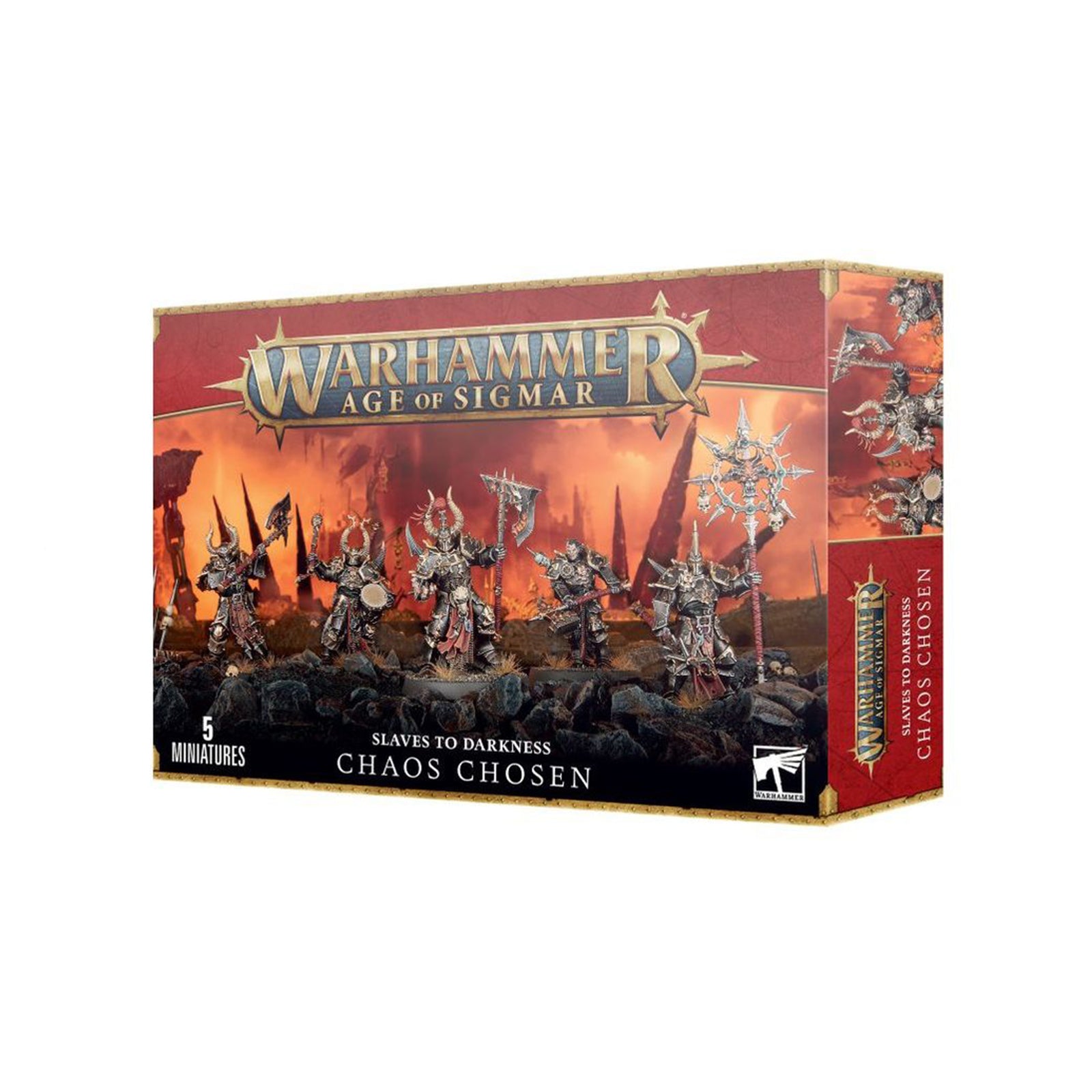 This multipart plastic kit builds five Chaos Chosen – hardened warriors for Slaves to Darkness armies in Warhammer Age of Sigmar. Each of these deadly fighters is armed with a soul splitter – accursed two-handed weapons in the form of hammers, axes, mauls, and greatswords – and clad in ornate plate armour. One model can be built as an Exalted Champion, one as a Skull Drummer musician, and another as an Icon Bearer with either a flag or eight-pointed star – the kit includes five alternate sigils to dedicate your icon to Khorne, Slaanesh, Nurgle, Tzeentch, or Chaos Undivided. The other two models can be built with a choice of weapons, and the kit includes eight helmeted and four bare heads to choose from, allowing you to easily personalise your Chaos Chosen.