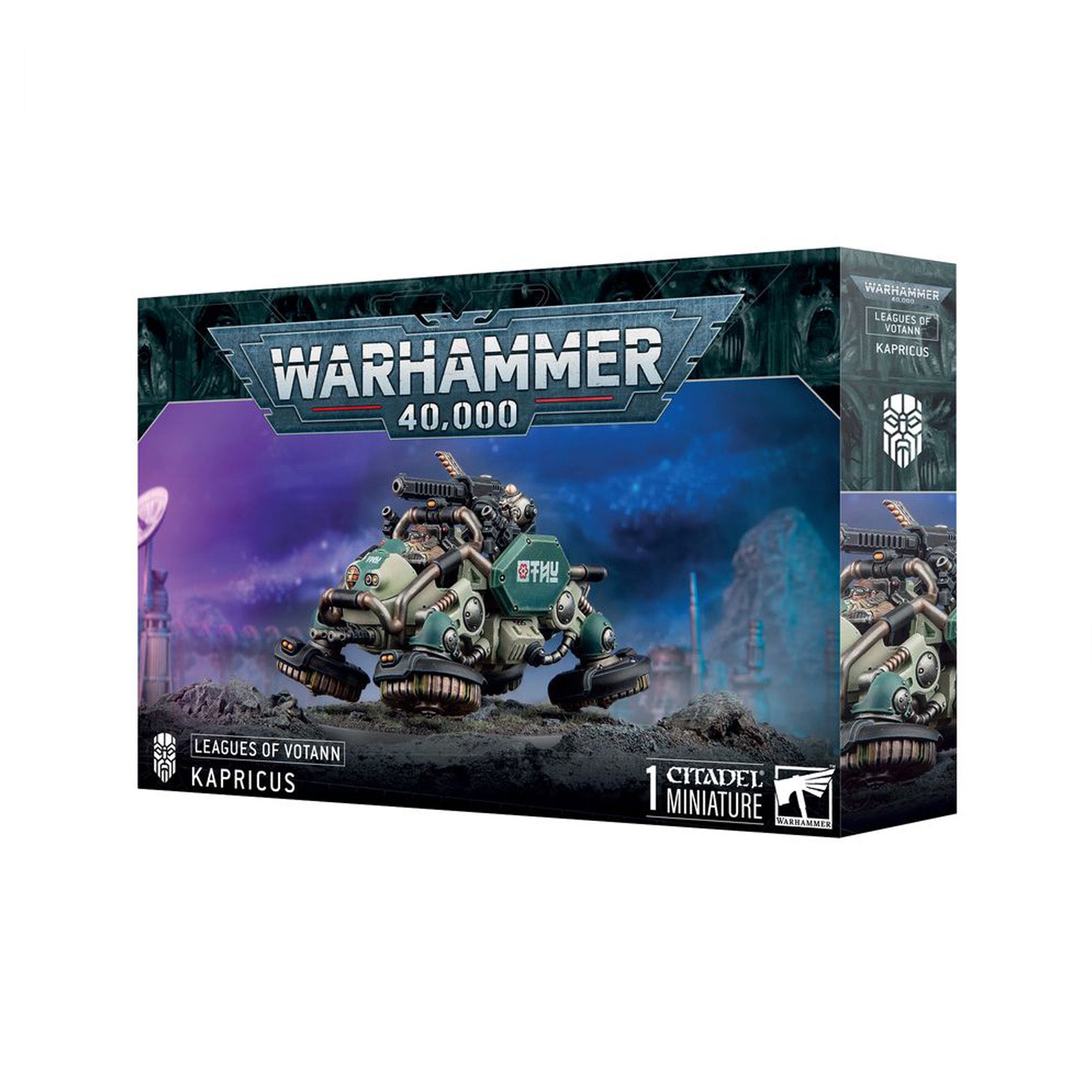 This multipart plastic kit builds a Kapricus Defender, a swift fire support vehicle for your Leagues of Votann armies in games of Warhammer 40,000. It's fast and tough with one pintle-mounted heavy weapon – your choice between an armour-busting magna-rail cannon, or an infantry-shredding HYLas rotary cannon – and twin-mounted magna-coil autocannons. It's ideal for supporting your advance with plenty of extra firepower. You'll find six heads in the kit to customise the crew, including a pair of Ironkin heads.