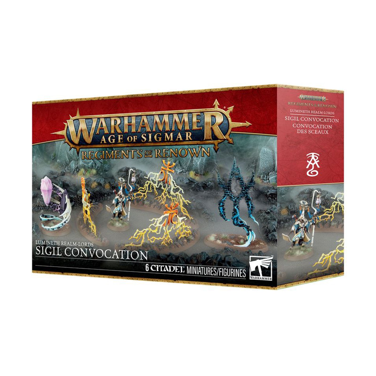 This multipart plastic kit builds a Sigil Convocation – a Regiment of Renown for your Cities of Sigmar, Daughters of Khaine, Fyreslayers, Idoneth Deepkin, Kharadron Overlords, Seraphon, Stormcast Eternals, and Sylvaneth armies in games of Warhammer Age of Sigmar. The individual units can also be used in your Lumineth Realm-lords army, and you'll save money compared to buying them individually. You'll find a Scinari Calligrave, along with a set of Endless Spells – a Sanctum of Amyntok, Hyshian Twinstones, and a Rune of Petrification. Add some powerful magic to give your armies a boost.