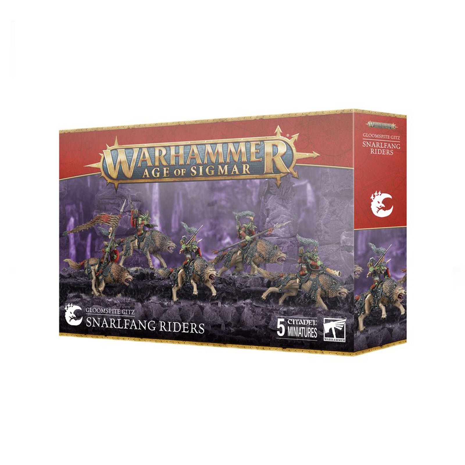 This multipart plastic kit builds five Snarlfang Riders – ferocious beasts with diminutive grot riders. Each Snarlfang Rider can be built aiming their grot bow or brandishing their stikka to spear the foe, with the other weapon stowed on their back. The kit includes components to build riders as a Gitboss champion waving a crooked scimitar, a Horn Blaster musician, and a Gitflag Waver, as well as loads of interchangeable components that allow you to mix and match shields, heads, and wolf-tail tassles. These Gitmobbers stand out amongst the Gloomspite Gitz, making for a fun unit to build, paint, and add variety to your grotty horde.